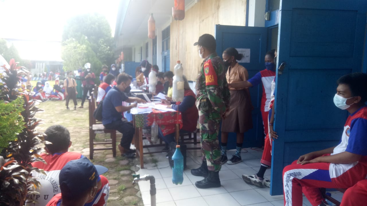 SuaraMabes, Nabire – Pada hari Jumat Tanggal 17 September 2021 Kepedulian dan kebersamaan Babinsa Kodim 1705-01/Nabire Serka Obet melaksanakan monitoring kegiatan pelaksanaan Vaksinasi Covid 19 di SMP Negeri 1 Nabire dalam rangka mendukung serta mensukseskan PON XX Papua Distrik Nabire Kabupaten Nabire
