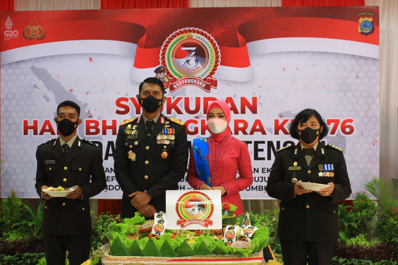 Acara Syukuran Hari Bhayangkara ke 76 ditandai dengan pemotongan tumpeng yang dilakukan oleh Kapolda Sulteng didampingi Ketua Daerah Bhayangkari Sulteng Ny. Luly Rudy Sufariadi yang selanjutnya diberikan kepada anggota Polri termuda dan anggota Polri tertua.