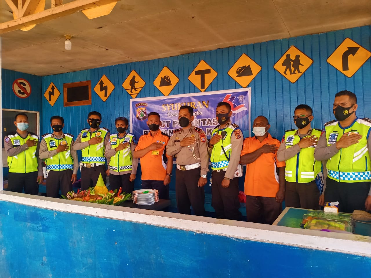 MediaSuaraMabes, Paniai – Dalam rangka mensyukuri HUT Polantas Bhayangkara yang ke – 66 di Wilkum Polres Paniai, Kasat Lantas Polres Paniai IPTU Hafirudin, SH bersama dengan anggota Sat Lantas Polres Paniai melaksanakan acara syukuran yang dilaksanakan di Pos Lantas Madi Distrik Pantim Kabupaten Paniai. Sabtu 25/09/2021 pukul 12:04 Wit.