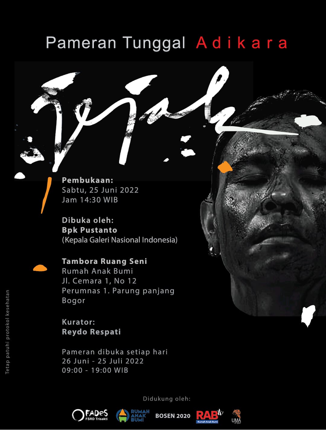 MediaSuaraMabes, Bogor – Perupa Adikara kembali menggelar pameran tunggalnya, setelah sebelumnya juga berpameran tunggal dalam event Parade Pameran Tunggal 51 Perupa yang selenggarakan oleh BOSEN2020. Pameran tunggal Adikara kali ini akan diselenggarakan di Tambora Ruang Seni, tepatnya di Markas Besar Komunitas Rumah Anak Bumi di Jalan Cemara I No. 12, Perumnas 1, Kecamatan Parungpanjang Kabupaten Bogor Provinsi Jawa Barat, akan diresmikan oleh Pustanto selaku Kepala Galeri Nasional Indonesia, yang juga mendapat dukungan dari Ketua Komite Seni Rupa Dewan Kesenian Jakarta, Aidil Usman, dan dibuka pada jam 14:30 Sabtu siang 25 Juni hingga 25 Juli 2022.