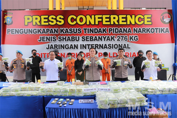 MediaSuaraMabes, Pekanbaru – Kepolisian Daerah (Polda) Riau kembali mengamankan pelaku peredaran gelap narkotika. Kali ini jumlahnya sangat fantastis. Yakni 276 Kg narkotika jenis sabu. Dimana dalam prosesnya, Polisi melalui Direktorat Reserse Narkotika berhasil mengamankan 5 pelaku. 1 Diantaranya tewas ditembak lantaran melakukan perlawanan yang membahayakn petugas.