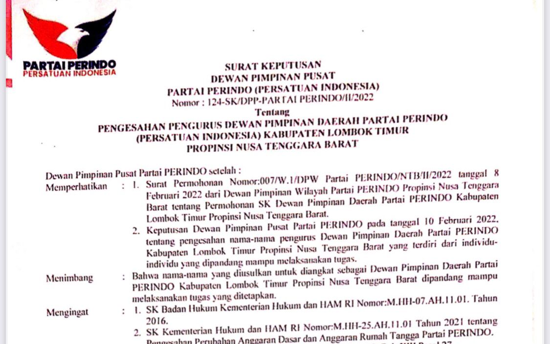 Sebagaimana diketahui, pengurus DPD Partai Perindo Kabupaten Lombok Timur periode 2022-2027 kini berjumlah 22 orang. Mereka ditetapkan berdasarkan Surat Kepengurusan Dewan Pimpinan Pusat Partai Perindo nomor : 124-SK/DPP-PARTAI PERINDO/II/2022.