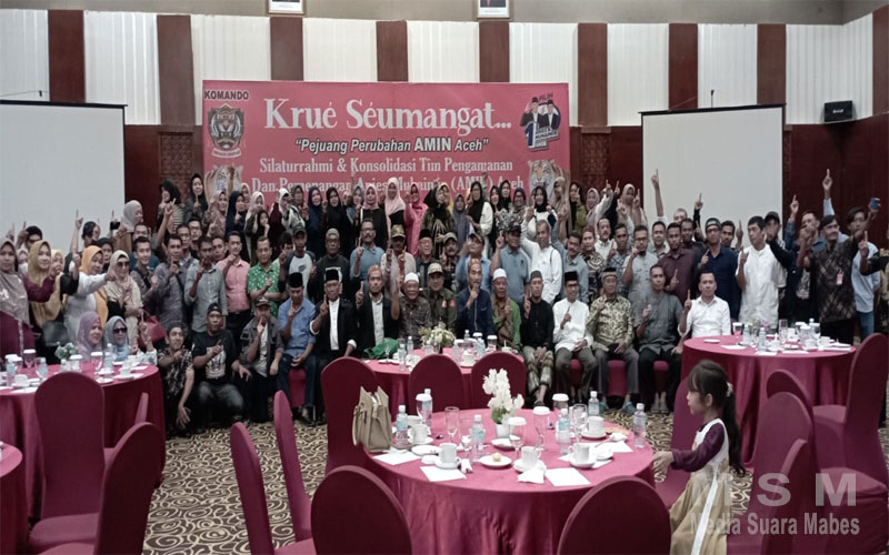 MediaSuaraMabes, Aceh – Tim pengamanan dan pemenangan AMIN (Anies-Muhaimin) dari Komando Brigade Aceh dikukuhkan. Acara pengukuhan berlangsung di Hermes Hotel Banda Aceh Sabtu, 20 Januari 2024 di sela-sela silaturrahmi dan konsolidasi tim Brigade Aceh bersama dengan para pimpinan simpul pejuang perubahan (tim relawan) yang ikut dihadiri anggota DPR RI asal Aceh Rafly Kande. Acara yang berlangsung tertib ini dimulai pukul 14.00 wib dan berakhir pukul 16.30 wib.