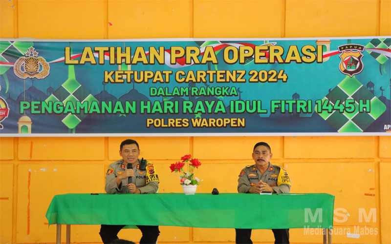 MediaSuaraMabes, Waropen – Dalam rangka untuk menyamakan persepsi, meningkatkan kemampuan, dan memperkuat profesionalisme Personel Polres Waropen dalam mengamankan Hari Raya Idul Fitri 1445 H Tahun 2024, Polres Waropen laksanakan Latihan Pra Operasi Ketupat Cartenz 2024, yang dilaksanakan di Aula Kerja Bersama dan Ruang Data Bag Ops, Rabu (03/04/2024).