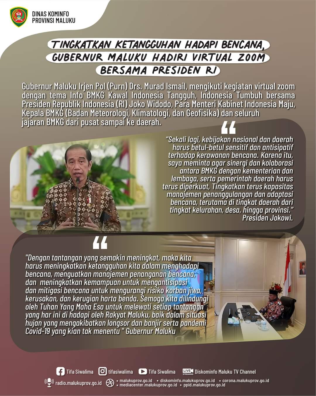 SuaraMabes, Maluku – Gubernur Maluku Irjen Pol (Purn) Drs. Murad Ismail, mengikuti kegiatan virtual zoom dengan tema Info BMKG Kawal Indonesia Tangguh, Indonesia Tumbuh bersama Presiden Republik Indonesia (RI) Joko Widodo, Para Menteri Kabinet Indonesia Maju, Kepala BMKG (Badan Meteorologi, Klimatologi, dan Geofisika) dan seluruh jajaran BMKG dari pusat sampai ke daerah.