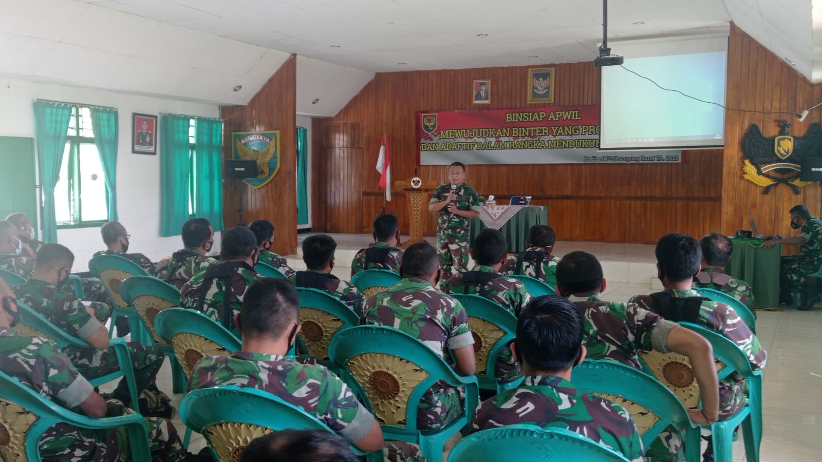 MediaSuaraMabes, Lampung Barat – Guna meningkatkan kesiapan prajurit dalam pelaksanaan pembinaan dan pemberdayaan wilayah pertahanan di darat, Kodim 0422/Lampung Barat menggelar kegiatan Pembinaan Kesiapan Aparat Kewilayahan (Binsiap Apwil) dan Kemampuan Teritorial (Puanter) Tahun 2022 bertempat di Aula Sudirman Kodim 0422/LB.
