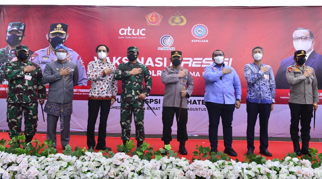 SuaraMabes, JAKARTA – Panglima TNI Marsekal Hadi Tjahjanto dan Kapolri Jenderal Listyo Sigit Prabowo meninjau pelaksanaan vaksinasi massal Konfederasi Serikat Pekerja Seluruh Indonesia (KSPSI) di PT. Kahatex, Sumedang, Jawa Barat, Kamis (5/8/2021).
