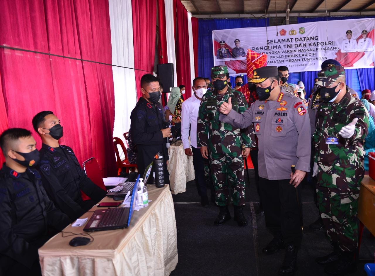 Panglima TNI dan Kapolri mengunjungi secara langsung vaksinasi massal di lokasi Pasar Induk Laucih, Medan. Di tempat itu, mereka berdua menyempatkan untuk menyapa secara virtual beberapa lokasi yang juga menggelar vaksinasi serentak di Sumut.