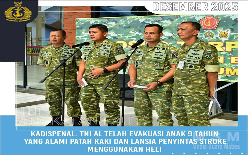MediaSuaraMabes, Jakarta – Kemarin, satu helicopter yang on board di KRI dr. Soeharso melaksanakan evakuasi medis melalui jalur udara sebanyak dua pasien, satu mengalami sakit stroke, satu mengalami patah tulang di kaki. Kedua pasien tersebut saat ini sedang dilaksanakan tindakan medis lebih lanjut di atas KRI dr. Soeharso-990,” Ujar Kadispenal Laksma TNI Tunggul saat Press Conference di Posko Satgas Gulben Halim Perdana Kusuma, Jakarta Timur.