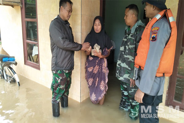 Anggota TNI dari Koramil 02/Kedung jajaran Kodim 0719/Jepara bersama anggota Kepolisian dari Polsek Kedung menyalurkan bantuan logistik guna mengurangi beban warga yang dilanda banjir.