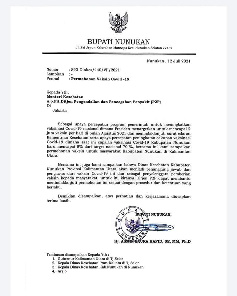 Menurut Mansyur Rincing, sesuai informasi yang diterimanya, Bupati Nunukan Hj.Asmin Laura Hafid,Ph.D telah berkirim surat kepada Menteri Kesehatan (Kemenkes) RI beberapa waktu lalu yang memohon tambahan vaksin, dan ini bukti nyata bahwa Pemerintah Kabupaten Nunukan melalui Satgas Penanganan COVID-19 bersinergi dengan TNI/Polri serius melaksanakan arahan presiden untuk melakukan vaksin kepada warga sesuai jumlah vaksin yang diterima Kabupaten Nunukan.