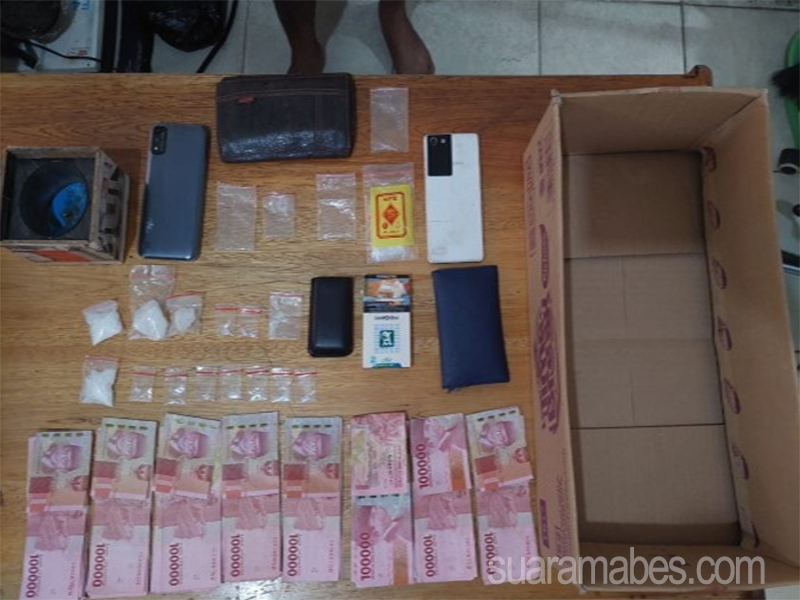 Disaksikan oleh perangkat RT setempat dan beberapa saksi, Petugas mengamankan barang bukti dari tangan pelaku berupa uang tunai 8.000.000 ( delapan juta rupiah ), 14 ( empat belas ) paket plastik yang berisi kristal putih yang diduga Narkotika jenis sabu dengan berat total sekitar 25,01 Gram Bruto, satu buah timbangan elektrik, dua buah handphone, serta beberapa lembar kantong klip plastik kosong.