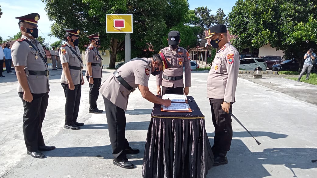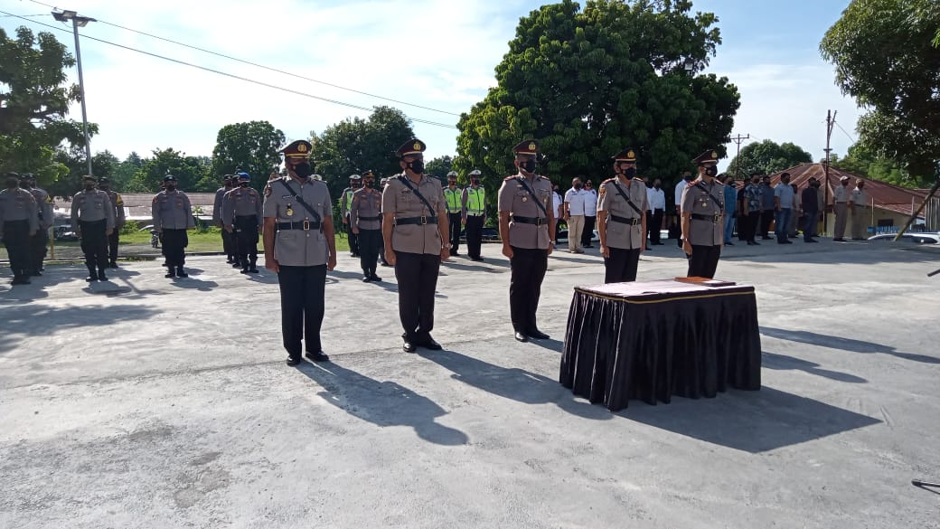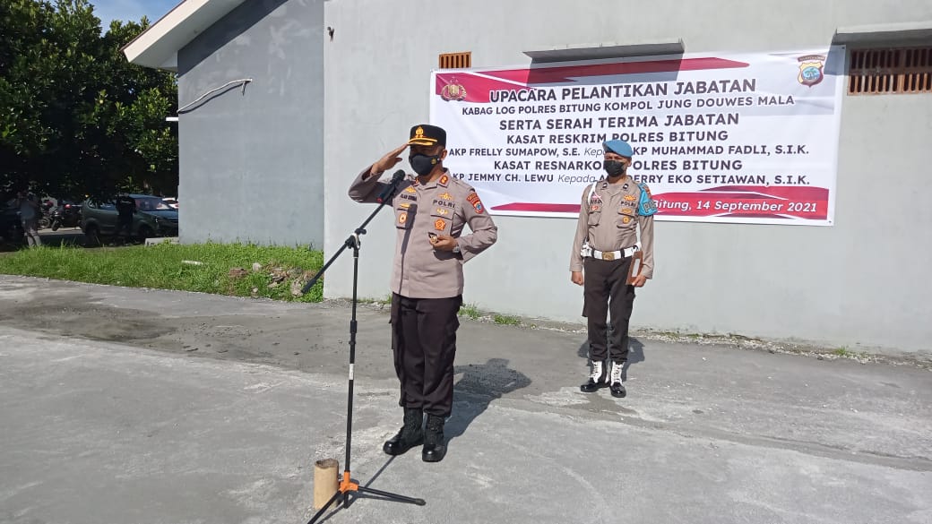 MediaSuaraMabes, Bitung – Kapolres Bitung, AKBP Alam Kusuma S. Irawan SH.SIK.MH, pimpin upacara pelantikan Kabag Log Polres Bitung serta serah terima jabatan Kasat Reskrim dan Kasat Resnarkoba Polres Bitung, (14/9/2021).