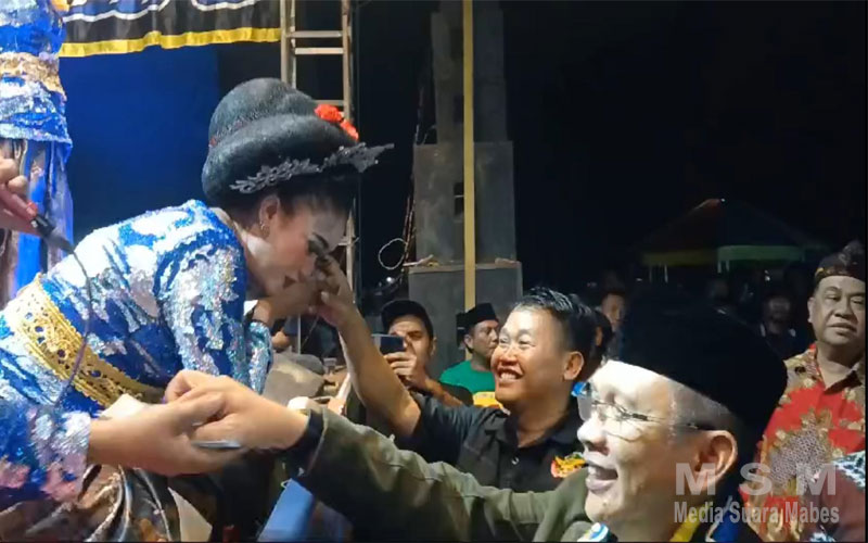 Tak berhenti disitu, Pj Bupati Bekasi Dani Ramdan kembali nyawer sinden dengan uang lembaran 100 ribu sambil tertawa-tawa.