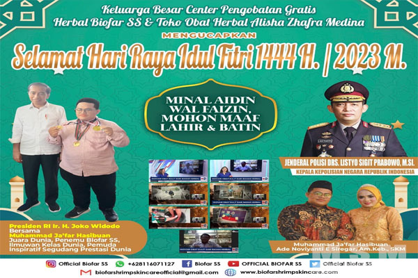 MediaSuaraMabes, Jakarta – Ucapan Hari Raya Idul Fitri, yang disampai kan Oleh sosok ilmuwan muda berkelas dunia, Muhammad Ja’far Hasibuan tokoh inspiratif pengubah dunia Penemu Biofar SS pemuda inspiratif segudang prestasi dunia juara dunia medis ilmuwan kelas dunia, yang pernah meraih medali emas dan World Invention Intellectual Property Associations Special Award dalam ajang Kompetisi Dunia China Sanghai International Exhibition of Inventions dan China (Shanghai) International Technology Fair (CSITF) di Sanghai, China, ketika terdengar ada uluran tangan Kapolri Jenderal (Pol) Listyo Sigit Prabowo, yang memberikan rumah untuk menampung pasien di Rumah Klinik Gratis Seluruh Dunia,Selasa (25/04/2023).