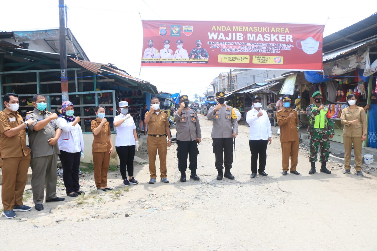 Di pasar sebelawan, Wabup dan Kapolres Simalungun meninjau proses kegiatan yang sedang berjalan di pasar Sebelawan sebari membagikan masker kepada warga.