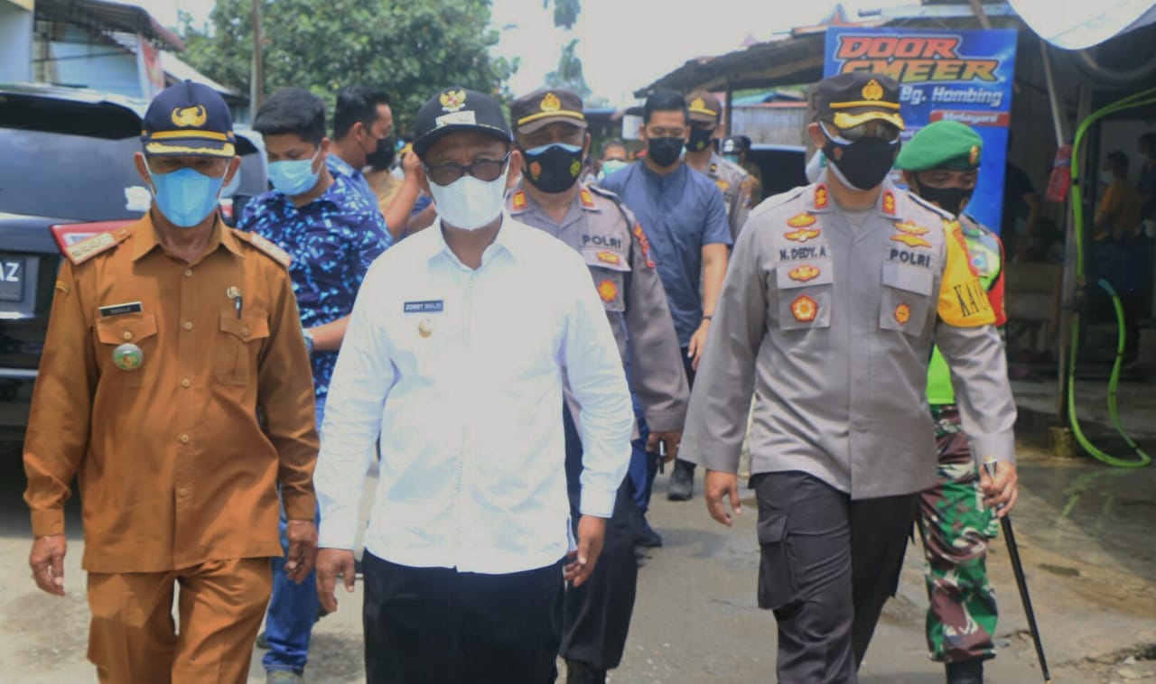 SuaraMabes, Simalungun – Bupati diwakili Wakil Bupati Simalungun H Zonny Waldi SSos MM bersama Kapolres Simalungun AKBP Nicolas Dedy Arifianto meninjau pos penyekatan Polres Simalungun di Simpang Dolok Merangir Kecamatan Tapian Dolok, Selasa 10/8/2021.