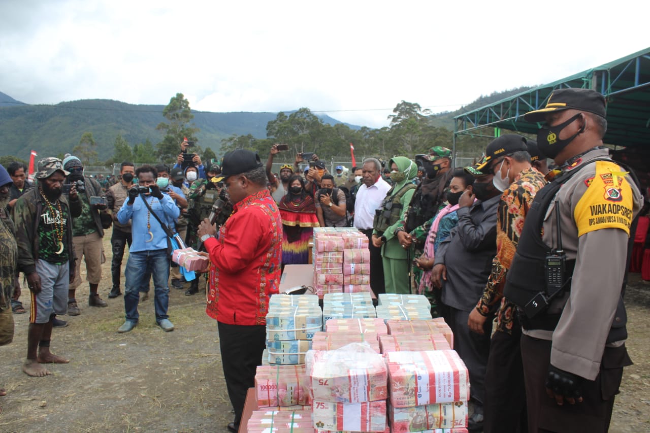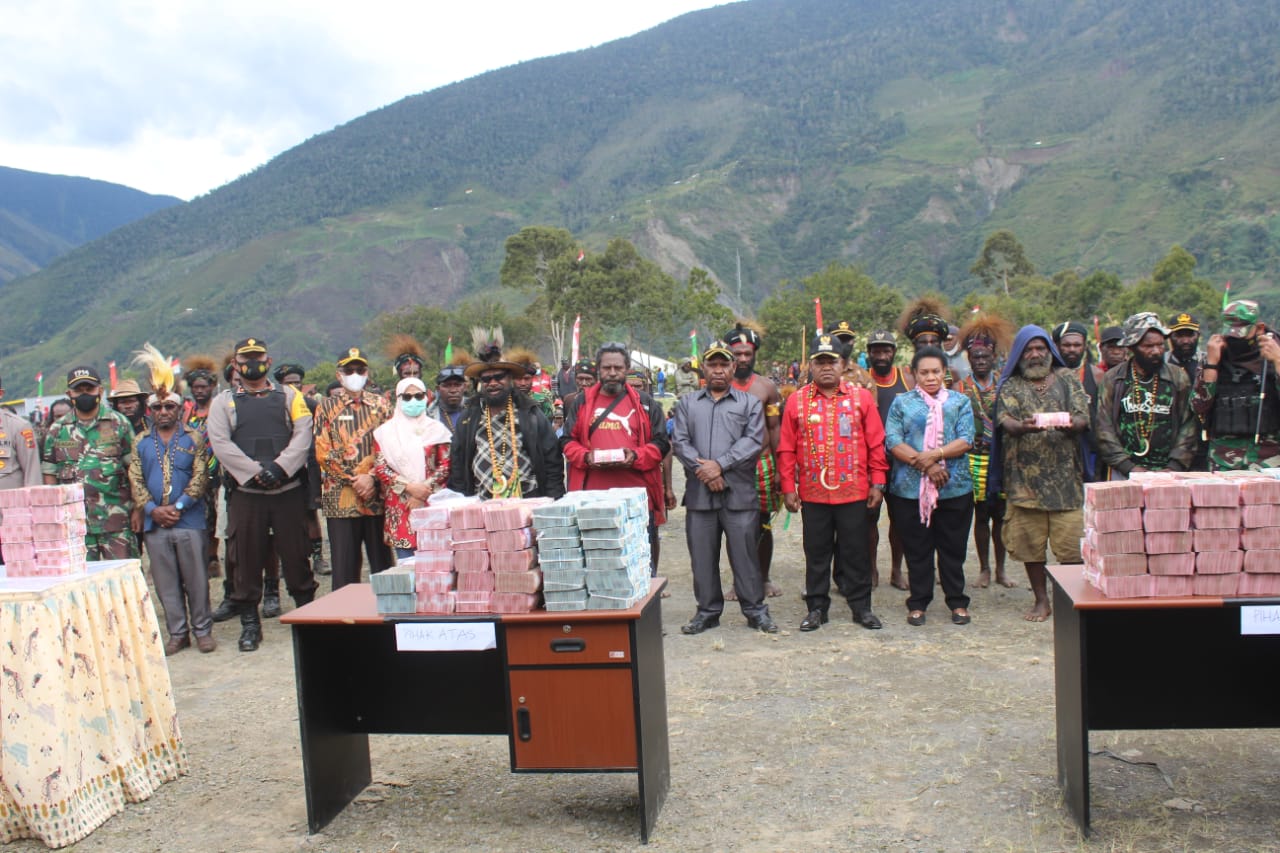 Dalam pelaksanaan kegiatan acara perdamaian tadi, bantuan yang diberikan kepada kedua belah pihak sebesar Rp. 12.000.000.000,- (Dua Belas Milyar Rupiah) yang terdiri dari Rp. 10.000.000.000 (Sepuluh Milyar Rupiah) dari Pemerintah Daerah Kabupaten Puncak Jaya dan Rp. 2.000.000.000 (Dua Milyar Rupiah) dari DPRD Puncak Jaya sedangkan tambahan 2 (Dua) ekor Babi dari ASN Kabupaten Puncak Jaya.
