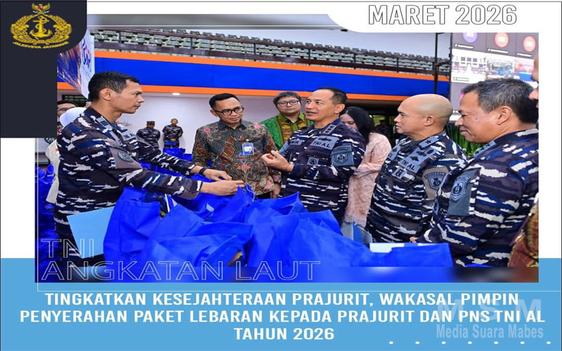 MediaSuaraMabes, Jakarta – Wakil Kepala Staf Angkatan Laut (Wakasal) Laksamana Madya TNI Erwin S. Aldedharma mewakili Kepala Staf Angkatan Laut (Kasal) Laksamana TNI Dr. Muhammad Ali memimpin kegiatan Pemberian Paket Lebaran dan Mudik Bersama TNI Angkatan Laut Tahun Anggaran 2026 yang dilaksanakan di Gedung Serbaguna Denma Mabesal, Jakarta, Jumat (13/3).