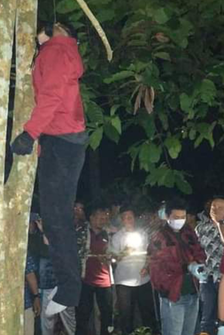 Kemudian hasil laporan warga, kepala Desa beserta aparat mendatangi kebun tersebut dan melihat diareal kebun itu terdapat mayat jenis  laki – laki dalam kedaan tergantung dibatang pohon duku, dengan seutas tali tas milik korban warna coklat dengan panjang kurang lebih 1 meter yang sudah terikat dileher korban.