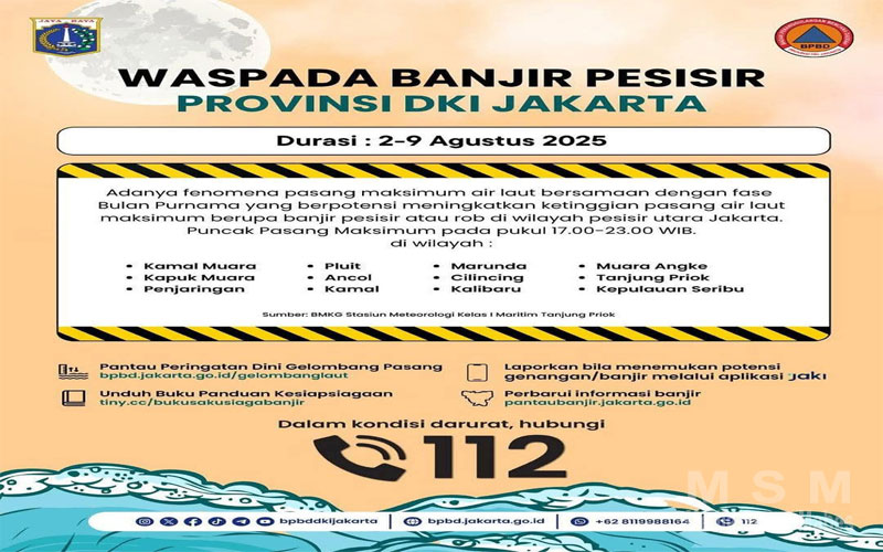 MediaSuaraMabes, Jakarta — Badan Meteorologi, Klimatologi, dan Geofisika (BMKG) Stasiun Meteorologi Kelas I Maritim Tanjung Priok mengeluarkan peringatan potensi banjir pesisir (rob) di wilayah pesisir Provinsi DKI Jakarta pada periode 2 hingga 9 Agustus 2025. Hal ini disebabkan oleh adanya fenomena pasang maksimum air laut yang bersamaan dengan fase bulan purnama, yang berpotensi meningkatkan ketinggian pasang air laut maksimum.