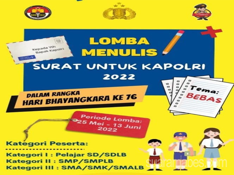 MediaSuaraMabes, Jakarta – Menyambut hari Bhayangkara ke-76, Kepolisian Negara Republik Indonesia (Polri) menggelar lomba menulis surat dengan tajuk “Surat untuk Kapolri Jenderal Listyo Sigit Prabowo 2022”. Lomba ini akan memperebutkan piala Kapolri Jenderal Polisi Listyo Sigit Prabowo